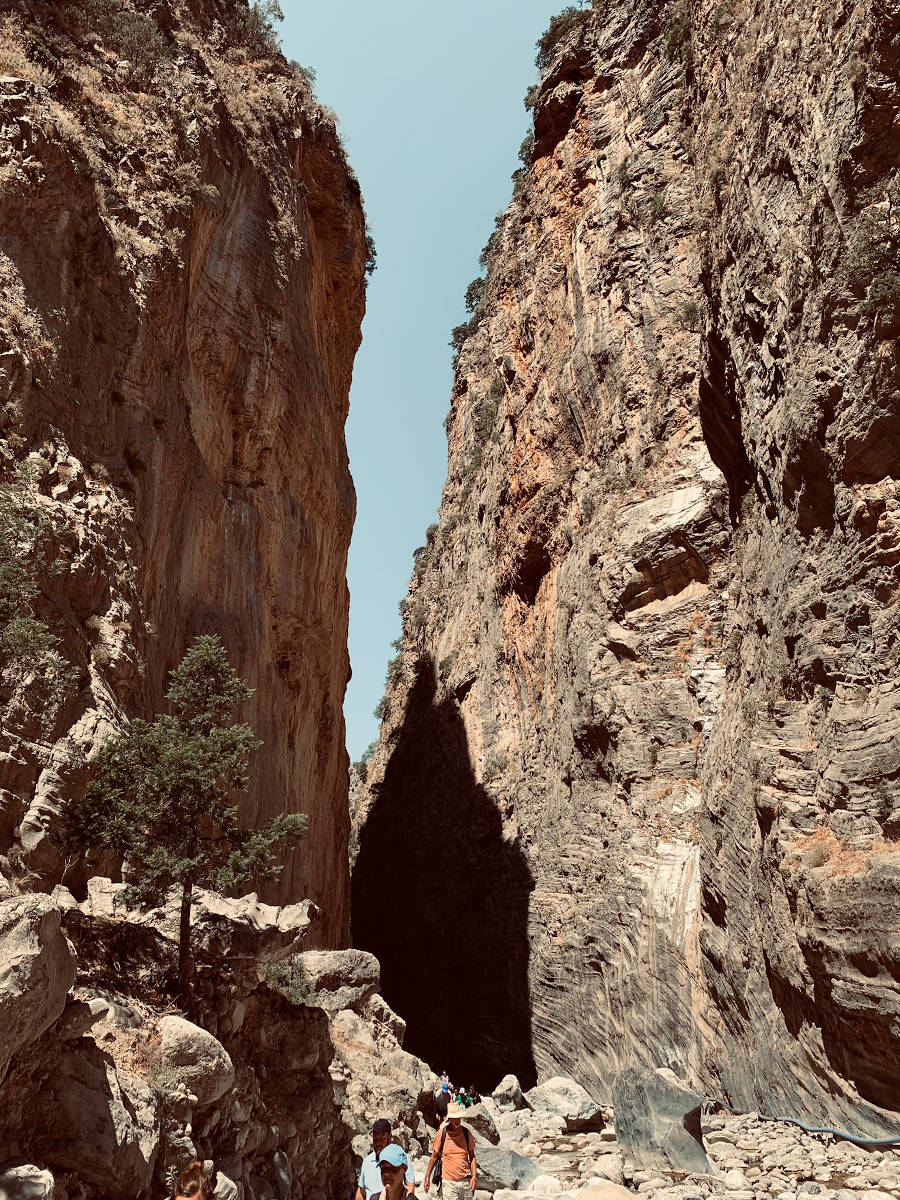 Beginnend bei einer Höhe von 1.250 m am nördlichen Eingang endet sie an den Ufern des libyschen Meeres in Agia Roumeli. Das Highlight und der Höhepunkt der Samaria Schlucht ist die „Eiserne Pforte“ genannte engste Stelle der Samaria Schlucht. Hier beträgt der Abstand der Felswände gerade einmal rund drei Meter.