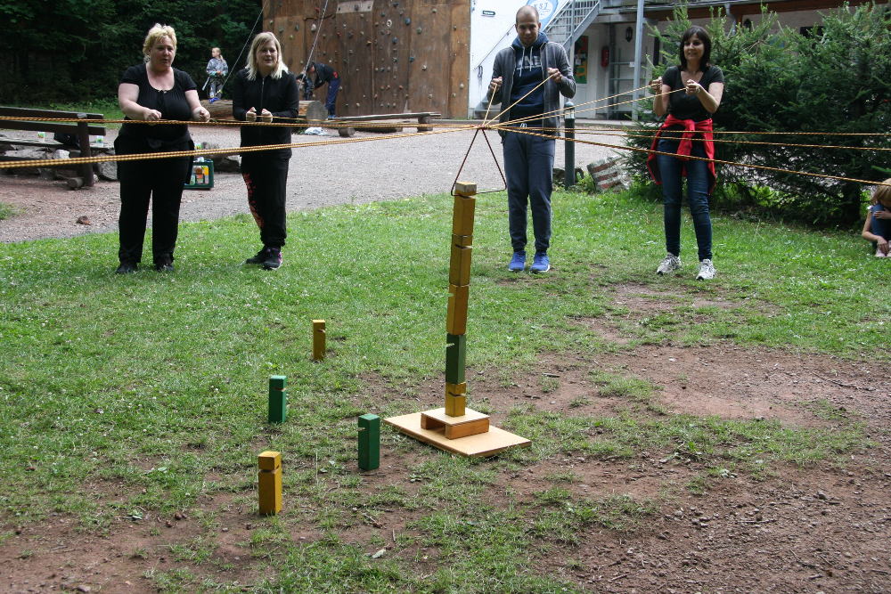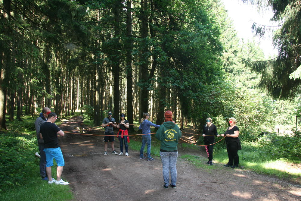 „Ich habe noch nie so ein gutes Quadrat gesehen!“ sagt Kathrin Kummer, pädagogische Betreuerin und stellvertretende Leiterin der Einrichtung. Mit verbundenen Augen haben wir ein Seil, welches wir mit beiden Händen festhalten mussten, durch Kommunikation, Teamgeist und räumliches Denken zu einem einigermassen gleichseitigen Rechteck ausbreiten können.